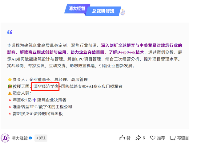 比如,针对建筑行业高管们的“高级工商管理建筑业总裁研修班”。5月23日-25日,新一期的学员在清华科技园紫荆会议中心进行学习。招生文章显示,研修班的招生对象为年营收5亿元以上建筑企业决策者、准备转型EPC/数字化的工程公司、需对接央企资源的民营老板,学费62000 元/人,每期招生名额为60人。