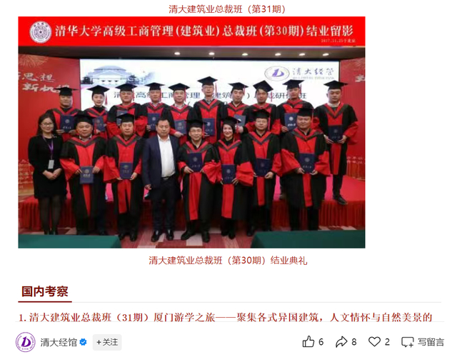 澎湃新闻调查则发现,“清大经管”在宣传中多次提及清华大学,如公司成立基于清华大学的百年沉淀、上课地点在清华科技园、邀请清华大学的专家等等。甚至,“清大经管”更是直接把学员的结业直接描述为“清华大学高级工商管理(建筑业)总裁班(第30期)结业留影”。