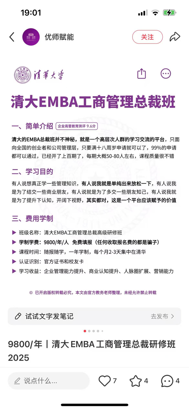 小红书博主“优师赋能”今年4月发布了一则“清大EMBA工商管理总裁班”的招生,文字颜色是“清华紫”、宣传图片左上角是清华大学校徽及字样。发稿前,该博文已经删除。