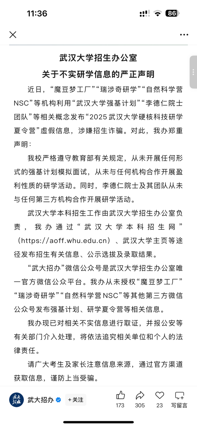 此外,6月11日,武汉大学招生办公室发布声明:武汉大学严格遵守教育部有关规定,从未开展任何形式的强基计划模拟面试,从未与任何机构合作开展营利性质的研学活动。同时,李德仁院士及其团队从未与任何第三方机构合作开展研学活动。