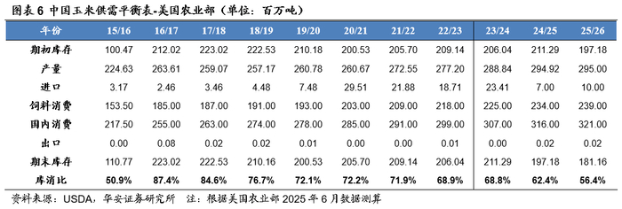 美国农业部2025年6月预测:2025/26年,中国玉米产量2.95亿吨,较24/25年度增加8万吨,预测值环比持平;进口量1,000万吨,较24/25年度增加300万吨,预测值环比持平;国内消费量3.21亿吨,较24/25年度增加500万吨,预测值环比持平;期末库存1.81亿吨,较24/25年度减少1,602万吨,预测值环比减少100万吨;库消比56.4%,较24/25年度下降5.96个百分点,预测值环比下降0.31个百分点,处于16/17年以来最低水平。