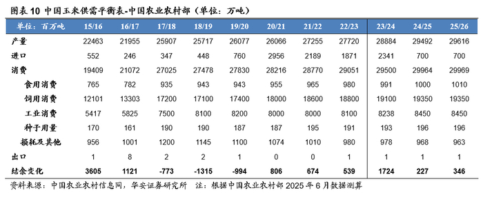 美国农业部2025年6月预测:2025/26年,全球玉米产量12.66亿吨,较24/25年增加4,265万吨,预测值环比增加100万吨;全球玉米消费量12.76亿吨,较24/25年增加2,161万吨,预测值环比增加136万吨;全球玉米期末库存2.75亿吨,较24/25年减少980万吨,预测值环比减少260万吨;库消比18.7%,较24/25年度下降1.03个百分点,预测值环比下降0.19个百分点,处于15/16年以来最低水平。中国农业农村部市场预警专家委员会6月报:25/26年玉米结余量预测值346万吨,较24/25年上升119万吨,预测值与5月持平。