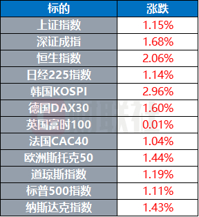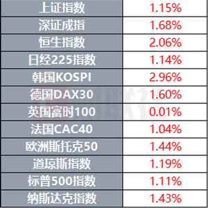 欧洲股市集体收涨,欧洲斯托克50指数收涨1.44%,德国DAX30指数收涨1.6%,英国富时100指数收平,法国CAC40指数收涨1.04%。