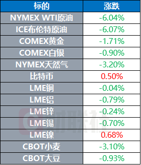 COMEX黄金期货跌1.71%,报3336.9美元/盎司;COMEX白银期货跌0.9%,报35.86美元/盎司。