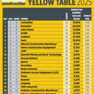 工程机械信息提供商英国KHL集团旗下《国际建设》杂志(International Construction)发布2025年度全球工程机械制造商50强排行榜(2025 Yellow Table — CONSTRUCTION EQUIPMENT SALES FOR THE WORLD’S TOP 50 OEMS)。2024财年,50强企业设备销售额达到2376亿美元,比上财年的2434亿美元下降了2.39%。中国上榜企业总数仍为13家,徐工集团和三一重工的工程机械年销售额都超过了100亿美元,保持在十强行列。前十大公司占据了50强总销售额的61.1%。