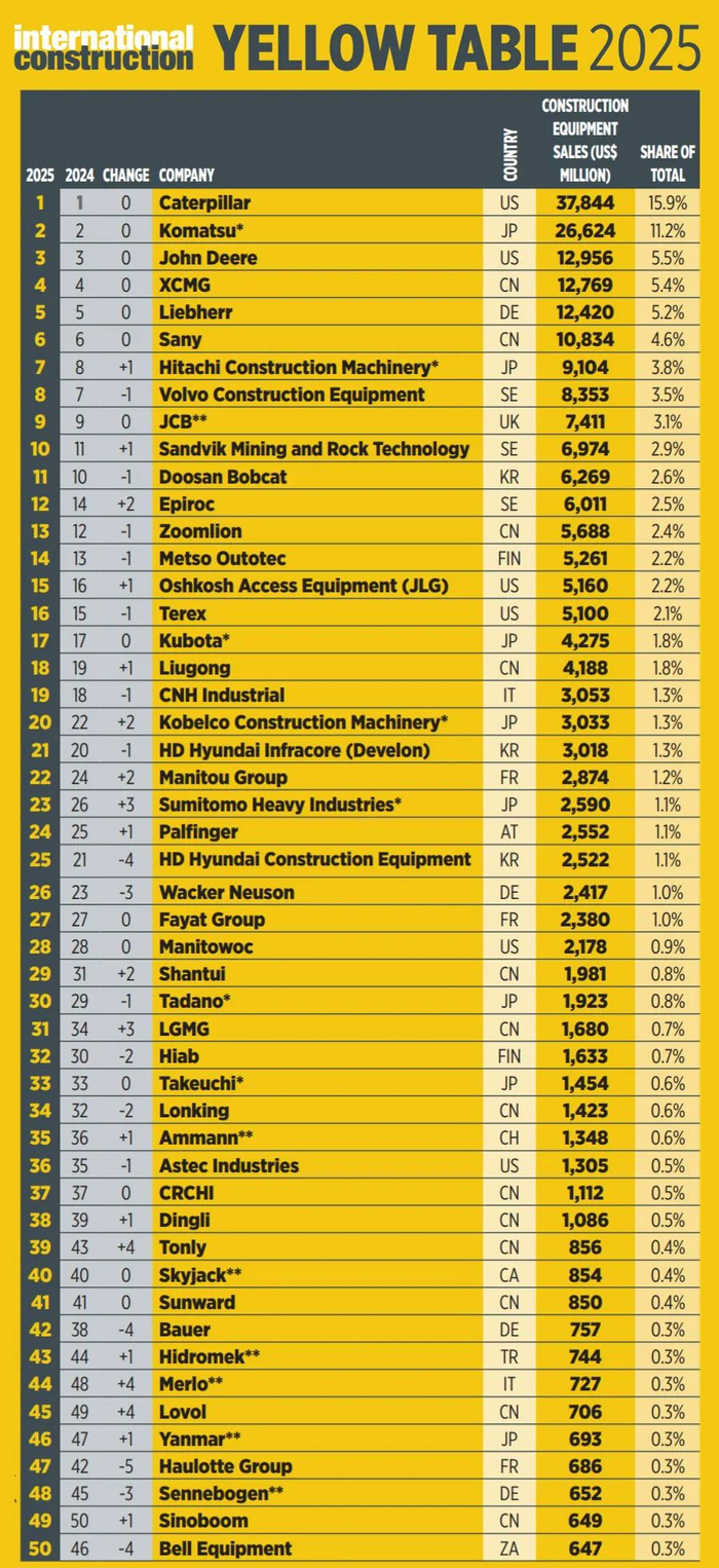 2025全球工程机械制造商50强排行榜,中国徐工、三一等13家企业上榜