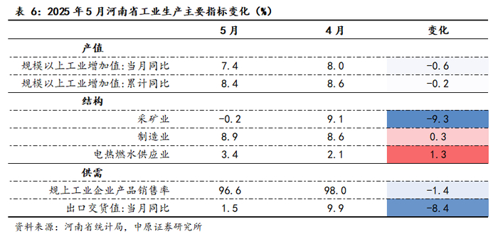 从生产端看,2025年5月份,河南省规上工业增加值同比增长7.4%,高于全国1.6个百分点。结构上看,当月采矿业增速大幅回落、同比由正转负为下降0.2%,其中煤炭、黑色金属、非金属矿物制品等行业增速均大幅下降;制造业仍是中流砥柱,5月全省规上制造业增加值同比增速较上月加快0.3个百分点至8.9%,其中汽车制造业、电气机械和器材制造业表现较好,分别增长26.7%、20.3%;电热燃水生产及供应业也大幅加快1.3个百分点为3.4%。从供需看,5月工业需求明显放缓,河南省规上工业企业产品销售率由98.0%下降为96.7%,出口交货值由9.9%下降为1.5%,外需相较于内需退坡更为明显。总体而言,5月河南省工业生产受需求减弱影响边际放缓,但在制造业支撑下仍然保持快速增长。