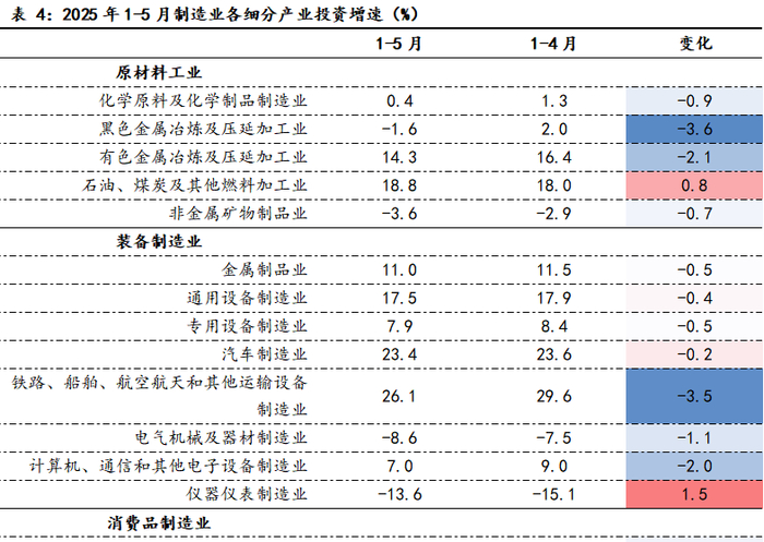 制造业投资增速有所回落但读数仍然较高为8.5%。“大规模设备更新”政策仍然是支撑制造业投资高增的主因,但拉动效果边际减弱,具体表现为1-5月设备工器具购置累计增速虽录得17.3%但已连续两个月下滑。分产业看,1-5月交通运输设备制造业、汽车制造业、纺织服装业投资表现突出,达到20%以上高增速;边际上看,造纸业、文娱用品制造业、仪器仪表制造业等投资力度加大。