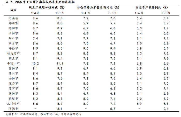 河南省18地市经济运行情况:从静态数据观察,1-4月河南省有6个城市工业生产超过全省平均水平,其中平顶山市表现突出;有六成的城市社零增速超过或持平全省平均水平,其中许昌市位居首位;有半数城市固投增速达到7.0%以上,其中驻马店市和漯河市分列一二。从动态数据观察,1-4月河南省各城市工业生产普遍回落,社零增速普遍加快,投资力度普遍有所增强。从政策层面观察,4-5月河南省在发挥区域特色、培育特色产业链方面出台系列政策。包括省级层面发布的《河南省医疗仪器设备产业园区布局建设方案》、《河南省临港产业发展规划(2025—2035年)》等,也有地市层面去商丘市发布的《关于印发商丘市培育壮大新兴产业行动方案(2025—2027年)的通知》。通过对特色产业的制度性规划,河南省不断培育打造新的经济增长点,推动各地市经济向更高质量迈进。