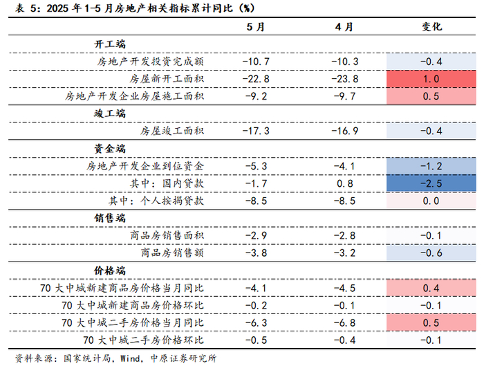 从投资端看,2025年1-5月全国固定资产投资(不含农户)191947亿元,同比增长3.7%,较1-4月放缓0.3个百分点。其中基础设施投资、制造业投资、房地产开发投资均有回落,分别录得5.6%、8.5%和-10.7%。