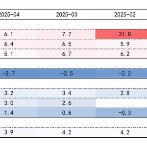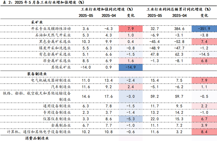 从价的角度观察,5月PPI同比增速为-3.3%,连续三个月降幅走阔,一方面是国际原油价格下跌带动国内相关工业品价格下降,另一方面是需求不足导致煤炭、钢材等能源、原材料类工业品价格低迷。从利的角度观察,2025年1-4月全国规上工业企业实现利润总额21170.2亿元、同比增长1.4%,全国工业企业利润持续回升,主要得益于“以旧换新”政策的持续加力促使装备制造、高技术制造业利润修复。