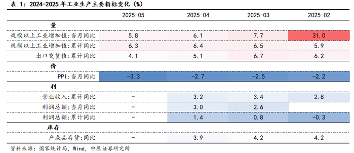 从生产端看,2025年5月份,全国规模以上工业增加值同比增长5.8%,较上月继续回落0.3个百分点,但仍保持韧性。