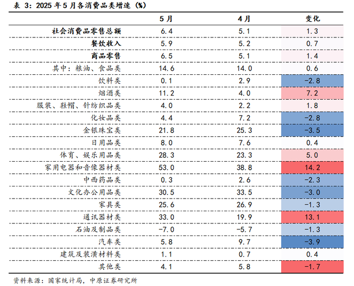 从消费端看,2025年5月社会消费品零售总额41326亿元,同比增长6.4%,增速较上月大幅回升1.3个百分点。结构上看,仍然是粮油食品消费与“以旧换新”消费共振驱动社零增速加速上行。一方面,5月份“五一”假期叠加端午假期创造更多消费场景,餐饮类消费和粮油食品类消费增速加快,分别达到5.9%和14.6%;另一方面,“以旧换新”政策叠加“618”消费节大促前置,文化办公用品类、通讯器材类、家电和音像器材类消费保持30%以上高速增长,分别为30.5%、33.0%和53.0%。但同时,受到内卷式竞争以及国际原油价格下跌等影响,价格因素导致汽车、石油等消费增速不及预期。