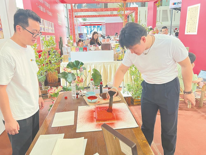 “2025海峡读者嘉年华·福州书展”期间,焦旭(右)在建阳新华书店·朱子主题书店展区体验福建省非物质文化遗产保护项目“建阳建本雕版印刷技艺”。林立华 摄