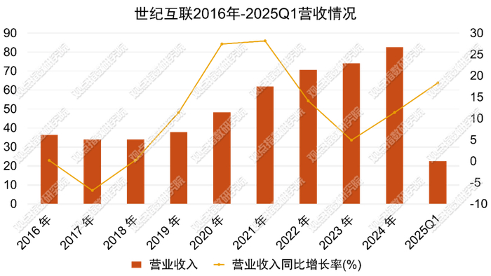 纵观近年来世纪互联的营收情况,可以发现其营收同比增速自2021年后达到顶峰后逐步下降,并于2023年后逐步回升,但目前2025年第一季度的营收同比增速还未恢复至顶峰。