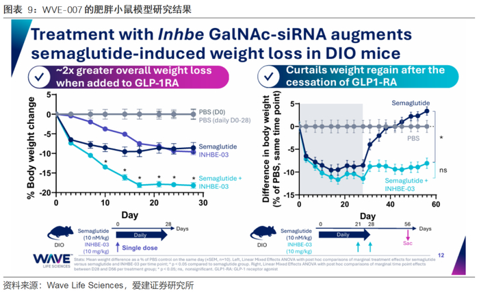 本次Wave基于抑制INHB的siRNA药物疗效口头报告题为“siRNA-INHBE Silencing in Mice Recapitulates Human Genetic Data and Demonstrates Improved Healthy Weight Loss Profile”,重点介绍了DIO小鼠研究的结果,评估了单药治疗(单独使用INHBE-siRNA)、联合治疗(INHBE siRNA和司美格鲁肽)以及维持治疗(停止司美格鲁肽治疗时使用INHBE siRNA)。