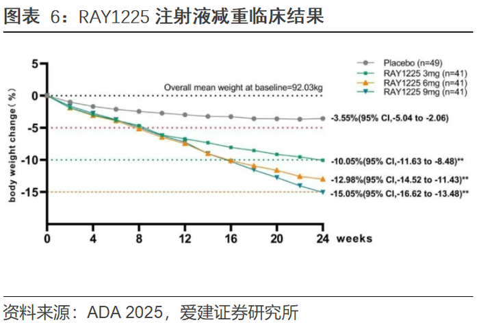 众生药业RAY1225注射液每两周给药1次治疗超重或肥胖参与者起效快,疗效强,安全性好。治疗24周时9mg组体重下降15.05% ,安慰剂组下降3.55%,体重下降≥5%的参与者比例高达95.1%。在安全性方面也展现出了独特的优势,未发现新的安全性风险。横向对比SURMOUNT-5(非头对头),RAY1225双周注射剂的24周减重效果与替尔泊肽接近,超过司美格鲁肽。