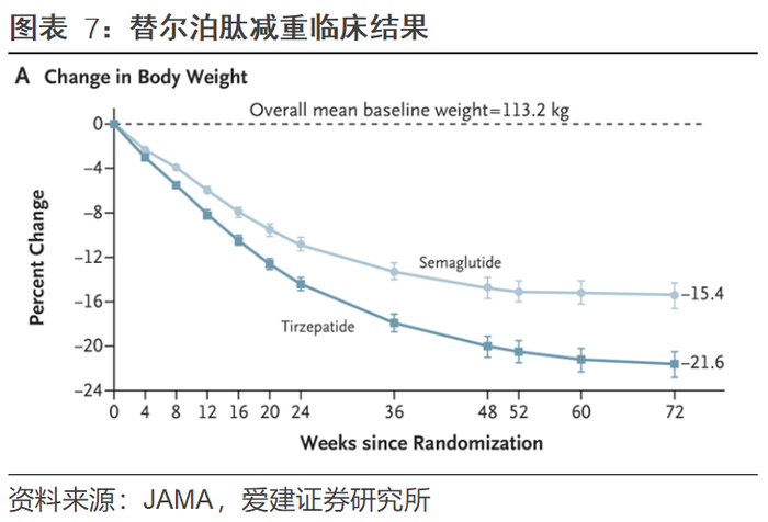 GLP-1/GIP激动剂:恒瑞HRS-9531减重效果超替尔泊肽,众生双周注射剂减重效果接近替尔泊肽。恒瑞HRS-9531注射液用于不伴糖尿病但至少有一种合并症的超重或肥胖患者,8mg每周皮下注射一次,治疗36周时与安慰剂组相比,HRS9531组体重相对于基线的百分比变化的最小二乘均值差为-21.1%,减重效果超过替尔泊肽。此外,与安慰剂组相比,在第36周时,HRS9531组改善了腰围、BMI、收缩压、空腹血糖、空腹血清胰岛素、HbA1c水平,并降低了甘油三酯水平。安全性方面,大多数治疗期间不良事件(TEAE)为轻度且与胃肠道相关,最常见的是腹泻、恶心和呕吐。没有受试者因TEAE而永久性停止治疗。