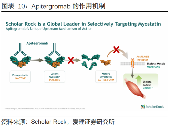 Apitegromab是Scholar Rock开发的一种靶向肌肉生长抑制素(myostatin)的全人源单克隆抗体,通过选择性结合骨骼肌中的肌肉生长抑制素前体形式(promyostatin)和酶切后的潜在形式(latent myostatin)来抑制肌肉生长抑制素活性形式的生成,从而解除其对肌肉生长的抑制。肌肉生长抑制素是生长因子TGF-β超家族的成员,主要由骨骼肌细胞表达,其基因的缺失与包括人类在内的多种物种的肌肉质量和力量增加有关。