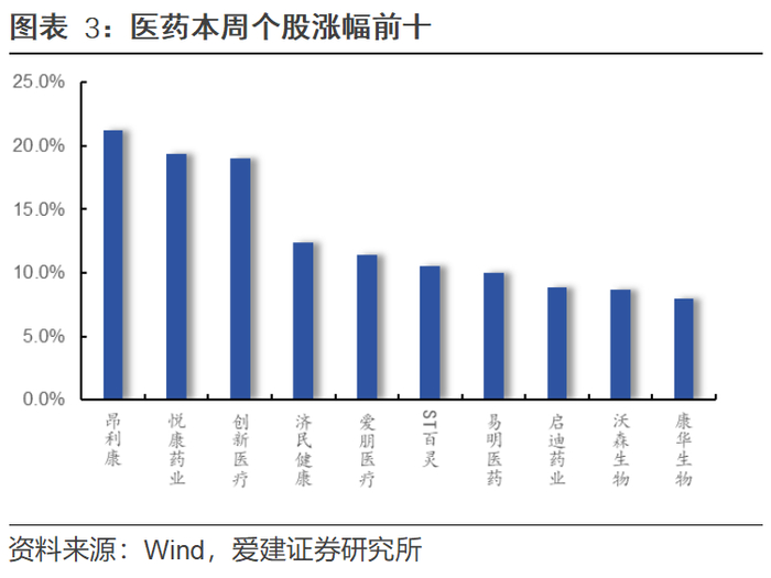 本周医药板块个股涨幅前十:昂利康(+21.21%)、悦康药业(+19.34%)、创新医疗(+18.96%)、济民健康(+12.36%)、爱朋医疗(+11.42%)、ST百灵(+10.55%)、易明医药(+10.02%)、启迪药业(+8.86%)、沃森生物(+8.63%)、康华生物(+8.00%)。