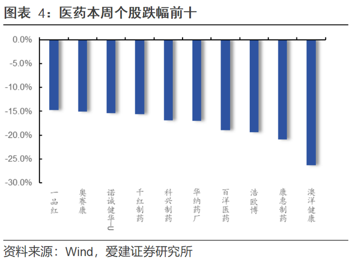 本周医药板块个股跌幅前十:澳洋健康(-26.33%)、康惠制药(-20.92%)、浩欧博(-19.37%)、百洋医药(-19.01%)、华纳药厂(-16.97%)、科兴制药(-16.85%)、千红制药(-15.64%)、诺诚健华-U(-15.34%)、奥赛康(-15.08%)、一品红(-14.78%)。