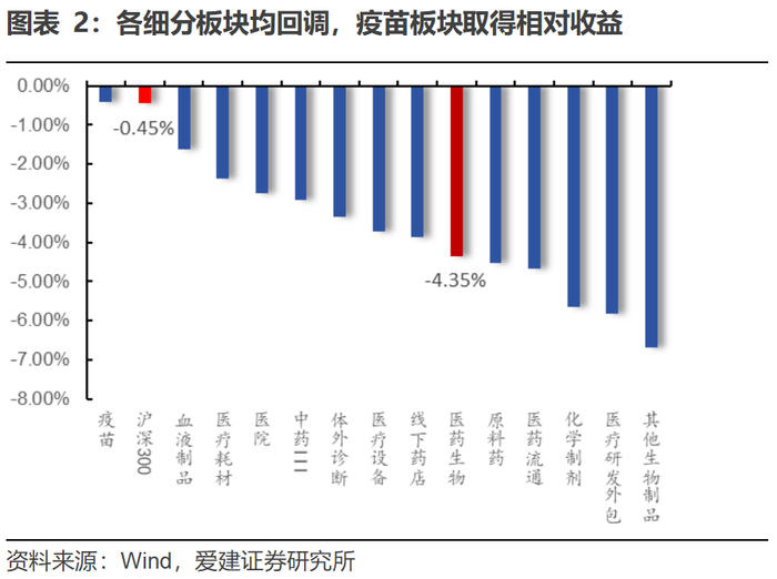 各细分板块均回调,疫苗板块跑出相对收益。本周医药各细分板块均出现回调,仅疫苗(-0.40%)跑赢沪深300指数,其他生物制品(-6.70%)、CXO(-5.83%)、化学制剂(-5.65%)表现垫底。