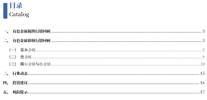 重点金属价格数据:本周上期所铜、铝、锌、铅、镍、锡分别收于77,990元/吨、20,465元/吨、21,845元/吨、16,810元/吨、118,280元/吨、260,560元/吨,较上周变动幅度分别为-0.52%、 +0.20%、 -0.48%、 -0.83%、 -1.46%、 -1.39%。本周上期所黄金、白银分别收于778.58元/克、8,664元/千克,较上周变动幅度分别为-1.81%、-1.75%。本周氧化镨钕、氧化铽、氧化镝、烧结钕铁硼N35毛坯分别收于44.5万元/吨、716万元/吨、164万元/吨、113.5元/公斤,较上周变动+0.68%、+0.49%、+1.23%、+0.89%。本周电池级碳酸锂、工业级碳酸锂、电池级氢氧化锂、澳洲锂精矿价格分别收于60000元/吨、59000元/吨、61600元/吨、540美元/吨,较上周变动-1.07%、 -0.92%、 -2.07%、 -0.92%。本周国内电解钴、0.998MB电解钴、分别收于22.65万元/吨、19.1美元/磅,较上周变动0.00%、-0.42%、。