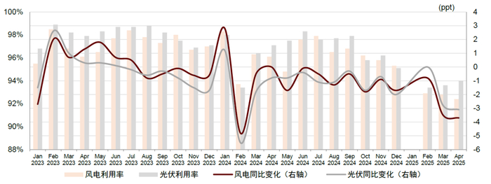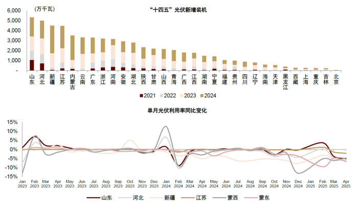 光伏新增装机以中东部分布式和西北集中式项目为主,其中,山东、河北、新疆累计新增光伏装机4,500~5,400万千瓦,位居前三;江苏、内蒙古、云南、广东、浙江、河南、安徽进入前十,新增2,900~4,500万千瓦。风光装机过半的省份近7个,达到40%+的省份接近20个,新能源逐步成长为主力电源。2025年1-4月,西藏、蒙西、青海、陕西、甘肃、河北、新疆光伏利用率在90%以下,天津、蒙东、宁夏在90~93%。