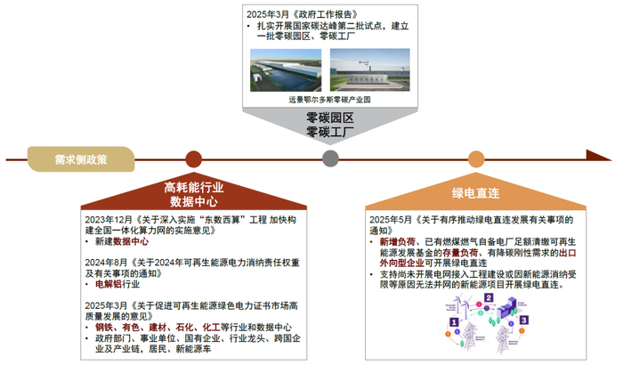 政策密集出台,注重从需求侧打开绿电消纳空间。我们观察到2024年以来陆续出台的相关政策涉及:绿电直连、零碳园区和零碳工厂、绿电绿证压实传统高耗能行业和数据中心等的消纳责任。我国可再生能源发展机制从注重价格、补贴、指标管理的供给侧保障型政策体系,逐步转向“消纳责任权重+绿证”为主的消费侧引领型政策体系。