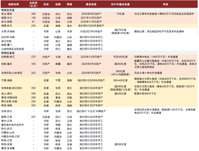 重点新能源省份加强特高压建设,有望打通优质新能源大基地消纳渠道。2025年1月,内蒙古发布2025年政府工作报告[31],要求加快推进沙戈荒大基地和蒙西至京津冀、库布其至上海、腾格里至江西、乌兰布和至京津冀鲁外送通道建设,力争新增并网4000万千瓦、发电量超3,000亿度。2025年5月,甘肃新闻发布会[32]提到加快构建“大送端”电网,其中陇电入鲁工程已投产,陇电入浙预计2026年投运,下一步将推动陇电入川工程尽早核准,并谋划新增2~3条外送通道,力争2030年特高压外送能力达4,800万千瓦,年输送电量超1,400亿千瓦时。