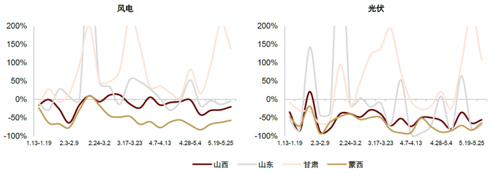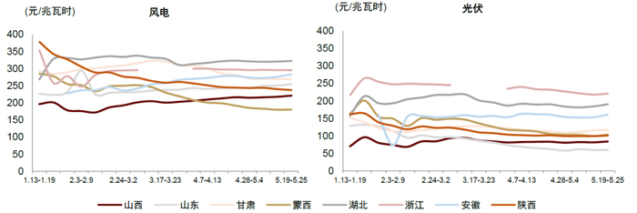 风电全天出力曲线更分散,现货均价高于光伏。截至2025年5月末,主要现货运行省份风电现货交易均价在181(蒙西)~323(湖北)元/兆瓦时,光伏现货交易均价在60(山东)~221(浙江)元/兆瓦时,风电均价较光伏高75~194元/兆瓦时。我们认为,风电新增装机规模小于光伏,且日内发电曲线更分散,在市场化交易较光伏具备竞价优势,交易电价更高。