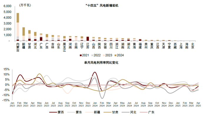 风光利用率分别自2H23以来呈同比下行趋势;三北地区风光利用率降至95%以下,新增装机较多的省份降至90%以下。风电新增装机以西北集中式陆风和东南沿海海风为主,内蒙古领衔“十四五”新增装机,达4,812万千瓦,远超其他省份,新疆、甘肃、河北、广东位居前五,新增1,200~2,400万千瓦。根据全国新能源消纳监测预警中心,2025年1-4月,西藏、北京、河北风电利用率在90%以下,山东、内蒙古、吉林、黑龙江、甘肃、青海、新疆在90~93%。