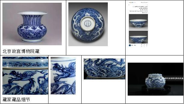 主要体现在:据藏家自己统计世界各博物馆中收藏有最多最重要的宣德早期至八年期间御制青花瓷器,共计有130多件的。与三大博物馆(北京故宫博物馆台北故宫博物院上海博物馆90多件其中以海水龙纹图饰有12多件)收藏展示品进行比对后,呈现出本器具有四个方面的一致性。