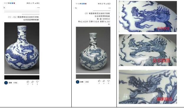 使用优质纯度极高的进口苏麻离青钴料是明代宣德时期御制青花瓷器的重要特征,是鉴定的一个重要依据。上图与三大博物馆馆藏瓷器进行比对。