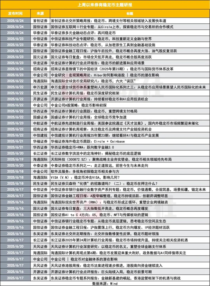 一周43篇研报和17场电话会 券商聚焦稳定币