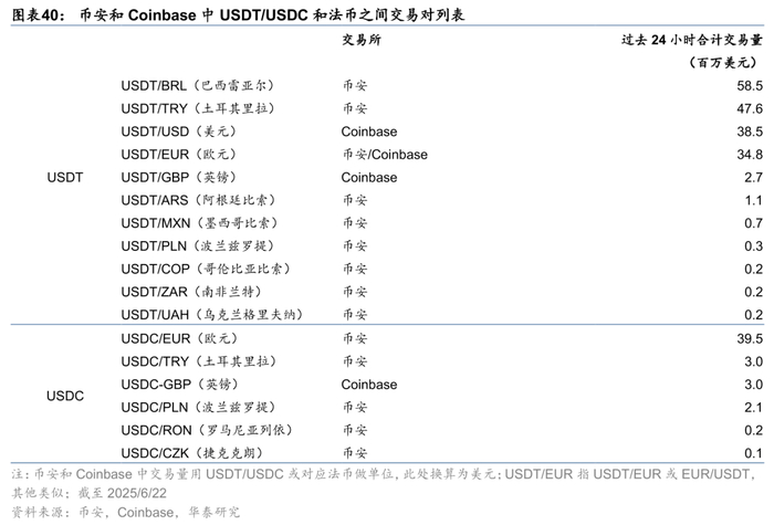观察稳定币的流动性,一方面是稳定币交易规模,另一方面是与稳定币/法币“交易对”是否有多种选择。以USDT为例,目前币安和Coinbase交易所提供USDT兑欧元、英镑、巴西雷亚尔法币的交易对,这些法币交易USDT有较为充裕的流动性,而合规的USDC法币交易对选择会少一些。有意思的是,巴西雷亚尔和土耳其里拉兑USDT的交易量是最大的,反映出这些国家USDT的渗透率较高。