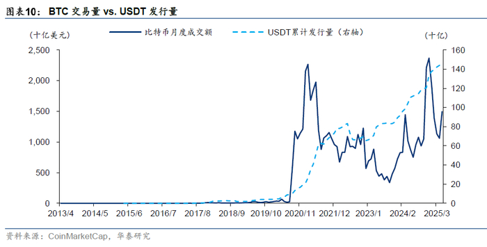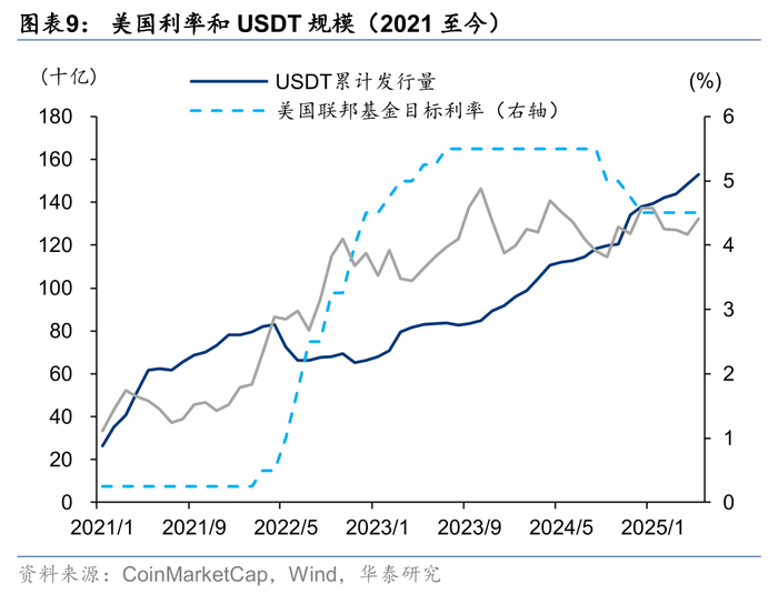 在稳定币不长的历史中,货币政策对其似乎有着巨大的影响。比如,在扩张性货币政策下,包括加密资产在内的风险资产交易活跃度上升,推动对稳定币的需求,更多稳定币被铸造出来。2020年新冠疫情后,美国进入零利率时期,稳定币才第一次进入真正的爆发期,USDT的累计发行量由2020年初的41亿上升至2020年末的209亿。相反,如果货币政策紧缩,对加密资产造成打击,用于交易加密资产的稳定币需求降低,稳定币会被“注销”。2022年3月美国开始了加息周期,叠加算法稳定币Luna在2022年的崩盘,稳定币市场进入了下行通道,USDT累计发行量由2022年3月末的819亿下降到7月末的662亿。之后几年USDT规模稳定上升,货币政策的影响相对较小,更多受需求强劲推动。