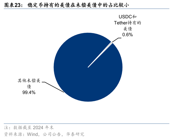 6.稳定币与货币流动性、国债有怎样的互动关系?如果不把稳定币自身考虑进来,稳定币发行对于法币流动性的影响大致是中性的。稳定币的发行规模或对短期国债利率产生影响。以目前美元稳定币的规模,其持有的国债占美国国债总量的比例仍然有限。