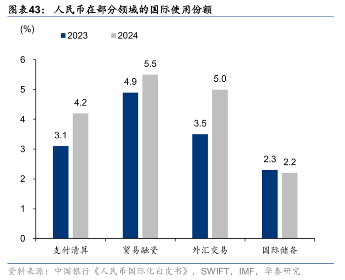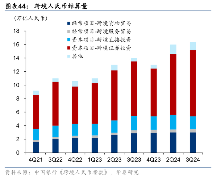 2024年人民币在支付清算、贸易融资、外汇交易中的使用份额分别为4.2%、5.5%和5.0%,相比2023年均有提升。此外根据中国银行数据,跨境人民币的结算量不断提升,3Q24约16.4万亿,相比4Q21的9.18万亿有明显提升,其中跨境货物贸易结算量由4Q21的1.59万亿提升至3Q24的约3万亿。按份额衡量,人民币为全球第四大支付货币、第三大贸易融资货币和第五大外汇交易货币。