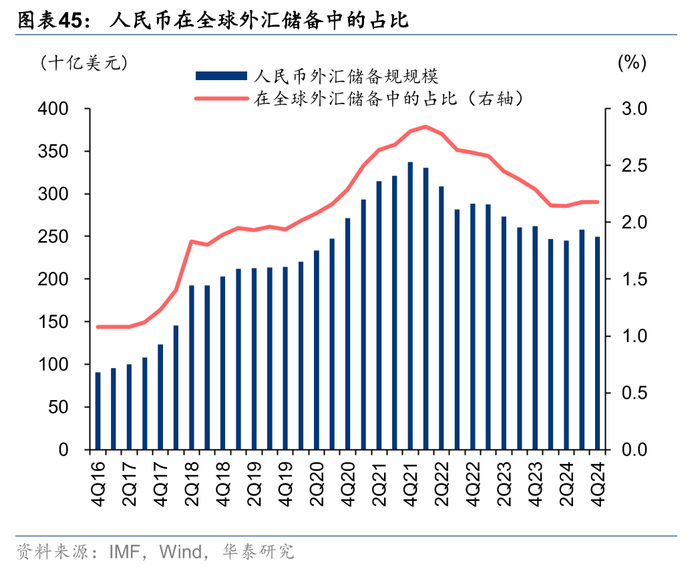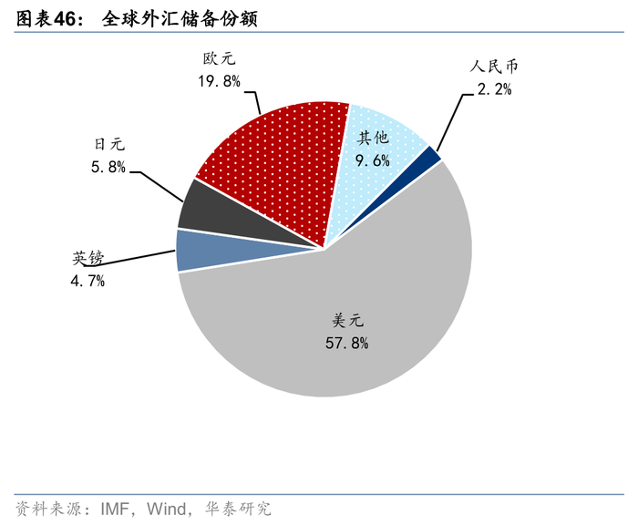 当前全球外汇储备仍然以美元和欧元为主,两者合计占比接近80%,人民币占比相对小,约2.2%,并且在21年后略有下降。