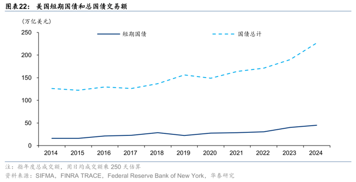 目前稳定币规模2,200亿美元,假设100%用于购买3个月短期国债,一年的交易量接近9000亿美元,约相当于2024美国短期国债交易量的2%。5月初美国财政部借款咨询委员会(TBAC)曾做出测算,认为未来3年稳定币总规模将上升8倍至2万亿。稳定币规模的扩大将提升其对短期国债市场的影响。