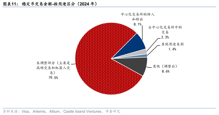 时至今日,稳定币的主要使用场景仍然是加密资产交易。由于区块链技术的匿名性,精准区分稳定币的实际用途存在难度,VISA层联合多家机构尝试根据钱包地址和交易特点进行区分和估计。根据VISA,2024年稳定币交易额为28万亿: