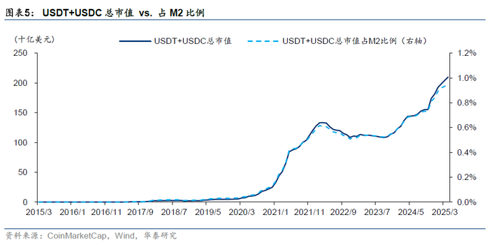 2.稳定币作为货币发行有何特点?稳定币规模受需求拉动,在铸币环节具有越来越明显的批发(to B)特征。同时货币政策对稳定币规模可能产生影响。截至2025/6/18,美元稳定币体量2200亿美元,约占美元M2的1%。