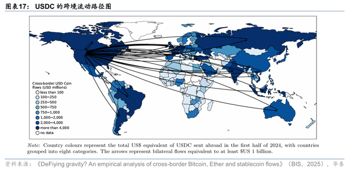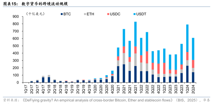 根据 BIS的测算,主要加密资产的跨境流动规模在近几年呈现出显著增长。在2021年初的增长尤其明显,跨境资金规模从1Q17的不到70亿美元提升至4Q21的超过8,000亿美元。在早期阶段,BTC占据交易量的主导地位,直到2Q19仍占约80%的份额,然而BTC 在2Q24时的规模占比已降至不到25%,这是因为稳定币交易量快速增长,逐步取代了比特币在跨境交易中的主导地位。稳定币跨境流动规模的增长可能反映了跨境贸易场景下对稳定币需求的增加,2021年约稳定币的跨境流动规模约有1.2万亿美元。