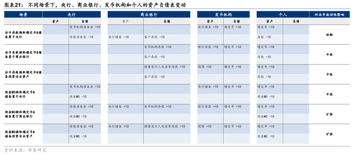 储备资产置于央行存款,对货币流动性的影响为“收缩/中性”。用户以法币存款换取稳定币,发币机构将法币存入中央银行,这些法币从而退出流通,对货币流动性的影响是“收缩”;如果用户使用现金M0向发币机构换取稳定币,对流动性影响“中性”,因为这相当于用实物现金一比一换取数字现金。