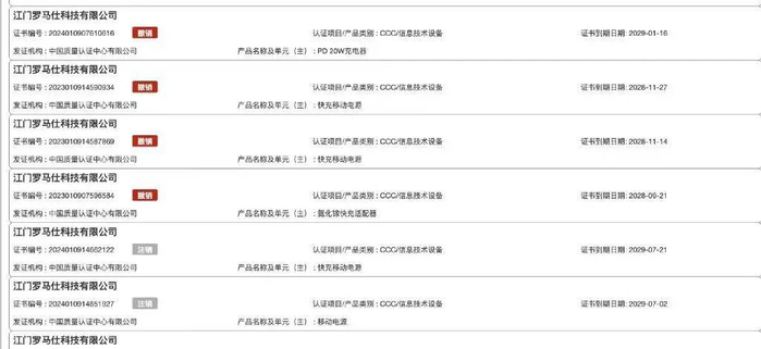 据此前报道,6月20日,国家市场监管总局全国认证认可信息公共服务平台显示,罗马仕科技相关公司的快充移动电源3C认证被大批暂停注销,剩余3C认证多与充电器、电源适配器相关。