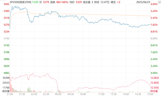 从隔夜市场表现来看,6月20日夜盘纸浆主力合约SP2509报收于5344元/吨,上涨幅度超2%,隔夜最大涨幅达4%;6月23日盘中高位走弱报收于5278元/吨,最终涨幅1.66%。