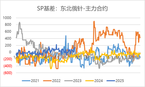 因此,在供应偏宽松的行业格局下,期货对标现货基准从主流交割品银星转向最便宜可交割品俄针,在俄针低价冲击下,期货价格跟随俄针价格同步走弱,从而以银星为基准的基差明显走扩,目前基本维持在800-1000区间(基差率超过10%),而以俄针为基准的基差虽处同期中性偏高水平,但基差相对较小,基本维持在-100到100之间(基差率维持在-2%到2%之间);对应的,山东地区银星与东北地区俄针的现货价差也走高到历史高位水平。