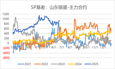 在供增需减格局下,纸浆期货价格在预期偏弱的预期下走弱,考虑到交割中最便宜可交割品(俄针),期货对标价格陆续从银星转为俄针,从而以银星为现货基准的基差持续维持偏高水平,基差率超10%,而以俄针为现货基准的基差则维持在-100到100区间,基差率在-2%到2%的合理范围内。