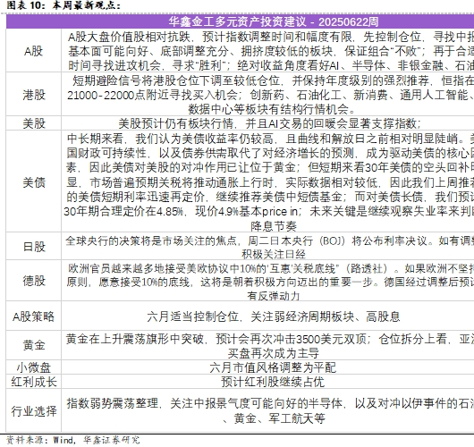 短期来看中美第二次谈判结果未有超预期结果,加之中东地缘冲突加剧影响全球风偏,市场震荡区间上沿低性价比位置调整压力较大,但政策托底预期下调整力度也有限。风格上还是哑铃配置为主,注意六月部分红利股分红期影响,期继续红利(银行、石油石化、保险、交运)配置为主,把握科技 (AI算力、军工)波段机会。短期扰动下能源和贵金属是对冲资产。